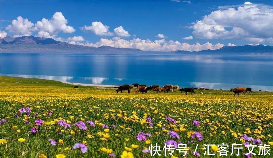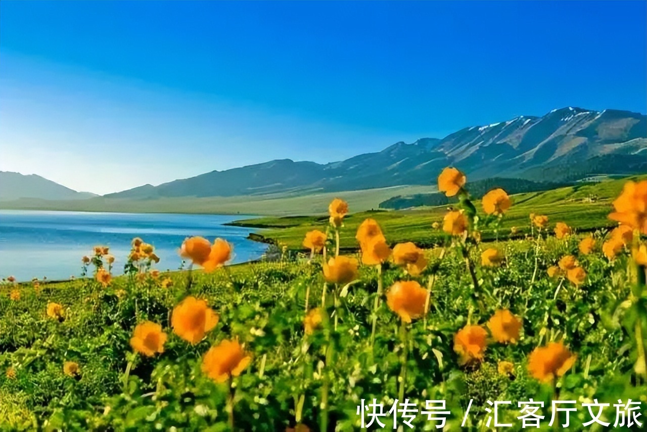 每到夏季,湖边草原上将开满各色的野花,花儿随着微风四面摇曳,伴着雪山下的蔚蓝湖泊,俨然一幅岁月静好的模样。